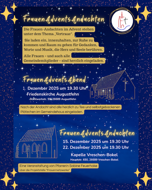 Am Freitag, den 7. November kam in Apen die Synode des Kirchenkreises zu ihrer dritten Tagung zusammen. Im Vordergrund standen die Verabschiedung des Schutzkonzeptes zur Gewaltprävention sowie die Wahlen zur 50. Synode Ev.-Luth. Kirche Oldenburg. Als Vertreter:innen wurden gewählt (alphabethische Reihenfolge):